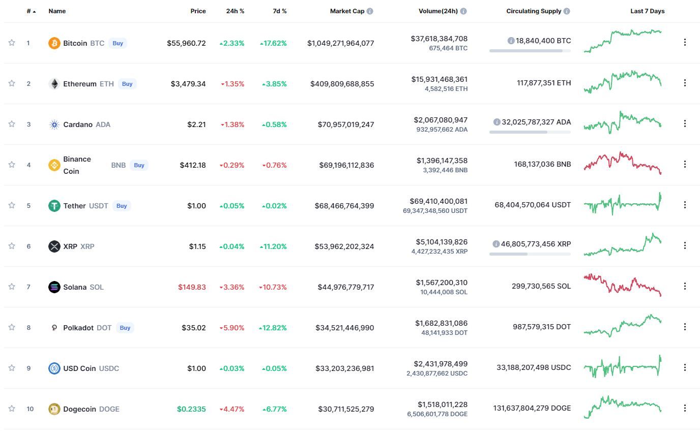 В топ-10 криптовалют лучший результат движения за сутки (+2,33%) и неделю (+17,62%) продемонстрировал биткоин. Наибольшие потери за 24 часа зафиксированы у Polkadot (-5,90%). В рамках недели больше других потерял Solana (-10,73%).