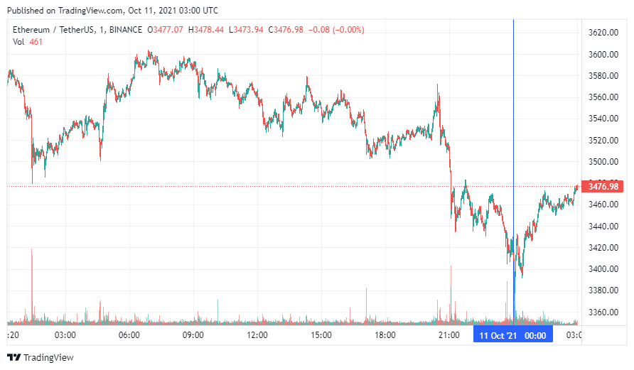 Вторая по капитализации криптовалюта – Ethereum – также начала понедельник с роста. По состоянию на момент написания новости, монета торгуется по $3476.