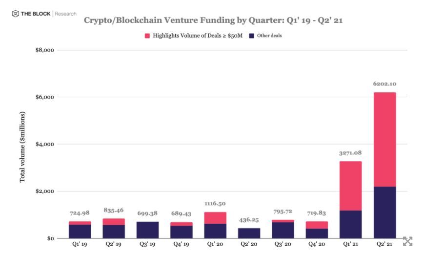 - Во второй половине 2021 года вырос объем венчурных инвестиций в крипто- и блокчейн-стартапы. Об этом пишет The Block.