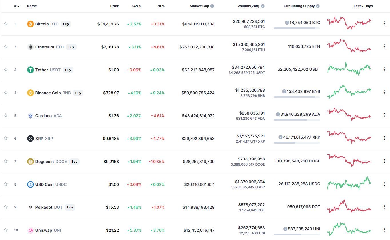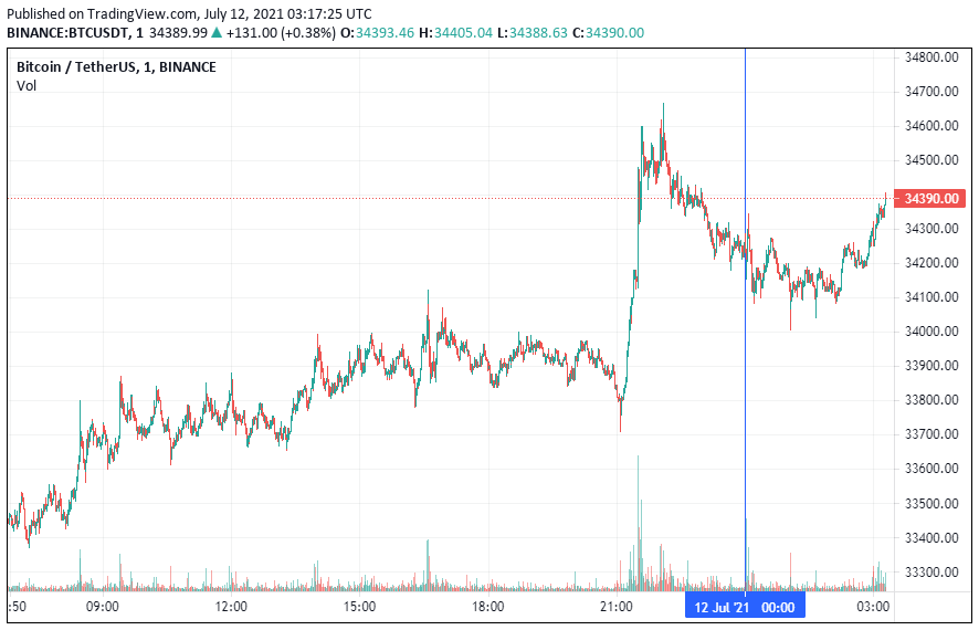Биткоин (BTC) начал первый день рабочей пятидневки с роста. По состоянию на 06:18 (МСК), криптовалюта торгуется по $34 390.