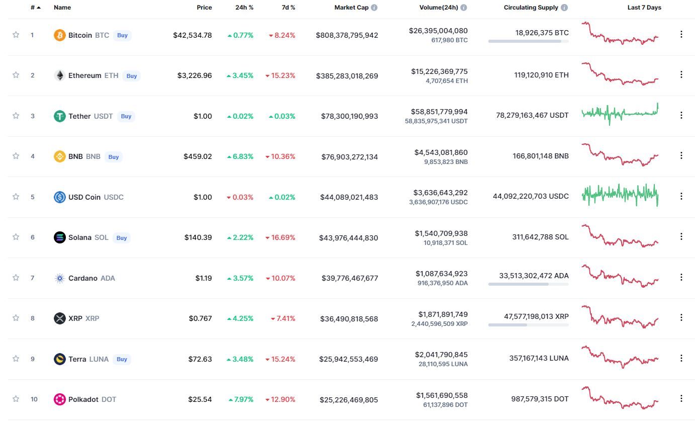 В топ-10 самых капитализированных криптовалют лучший результат движения за 24 часа зафиксирован у Polkadot (+7,97%). В рамках недели все монеты, за исключением стейблкоинов Tether и USD Coin, продемонстрировали отрицательную динамику движения. Наибольшие потери зафиксированы у Solana (-16,69%).