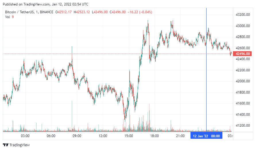 Биткоин (BTC) начал среду с небольшой коррекции. По состоянию на 05:55 (МСК), криптовалюта торгуется по $42 496. Минимум стоимости биткоина за 24 часа, по данным ресурса CoinMarketCap, зафиксирован на уровне $41 407, максимум – на высоте $43 001.