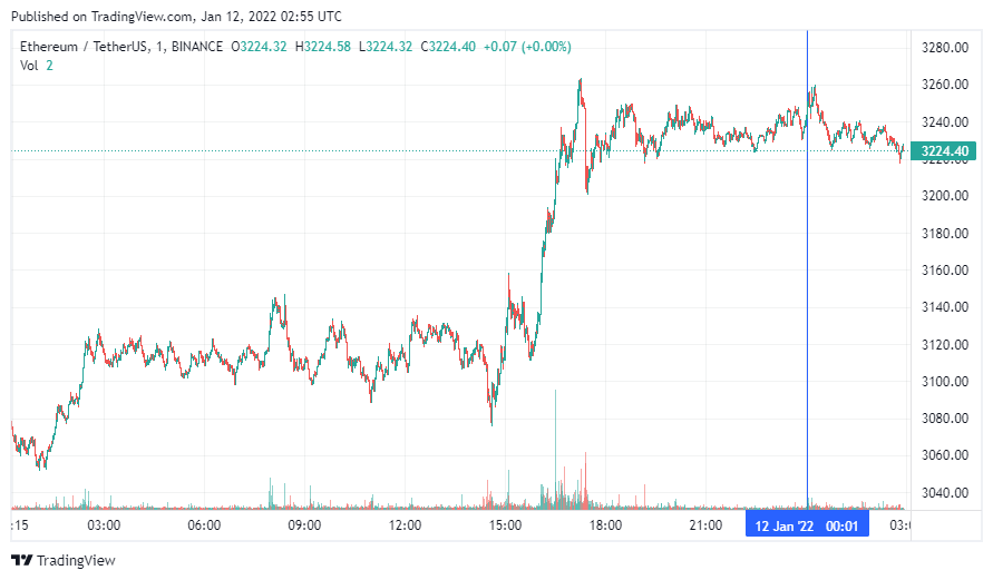 Вторая по капитализации криптовалюта Ethereum также начала день с коррекции. По состоянию на момент написания новости, монета торгуется по $3224.