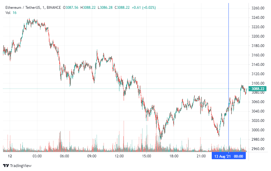 Вторая по капитализации криптовалюта – Ethereum – также начала пятницу с роста. По состоянию на момент написания новости, монета торгуется по $3088.