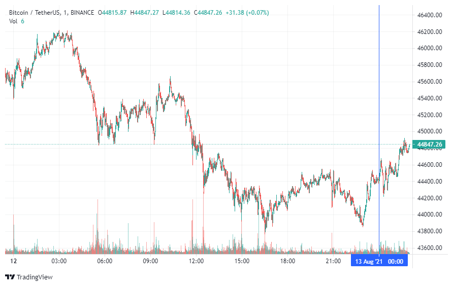 Биткоин (BTC) начал последний день рабочей пятидневки с роста. По состоянию на 06:20 (МСК), криптовалюта торгуется по $44 847. Максимум стоимости биткоина за 24 часа, по данным ресурса CoinMarketCap, был зафиксирован на высоте $46 228, минимум – на уровне $43 861.