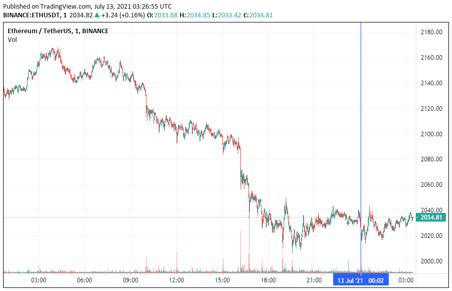 Вторая по капитализации криптовалюта – Ethereum – также начала день с роста. По состоянию на момент написания новости, монета торгуется по $2034.