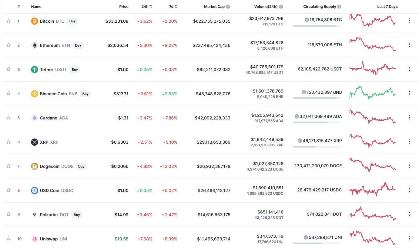 В топ-10 самых капитализированных криптовалют наибольшие потери за 24 часа зафиксированы у Uniswap (-7,68%), за неделю – у Dogecoin (-12,03%). Все монеты, за исключением стейблкоинов Tether и USD Coin сохранили отрицательную динамику движение в течение суток. В рамках недели продемонстрировать рост удалось только Binance Coin (+3,83%).