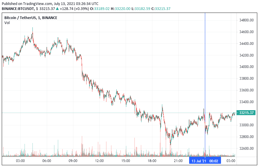 Биткоин (BTC) начал день с небольшого роста. По состоянию на 06:27 (МСК), криптовалюта торгуется по $33 215. Еще вчера курс монеты находился выше уровня $34 500.
