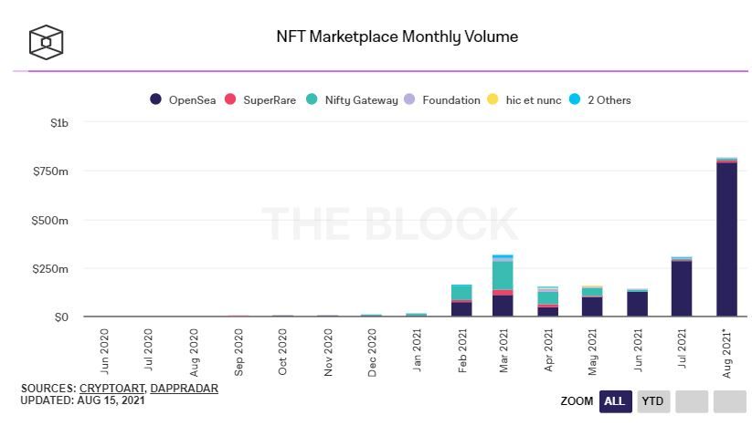 С начала августа на OpenSea было зарегистрировано сделок почти на $800 млн. Для сравнения, в июле показатель остановился на отметке $284 млн.