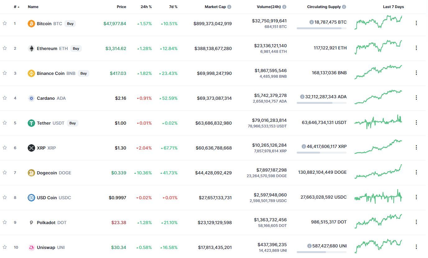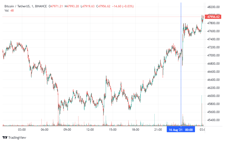 Биткоин (BTC) начал новую рабочую неделю с роста. По состоянию на 06:00 (МСК), криптовалюта торгуется по $47 956. Минимум стоимости биткоина за 24 часа зарегистрирован, по данным ресурса CoinMarketCap, на уровне $45 579.