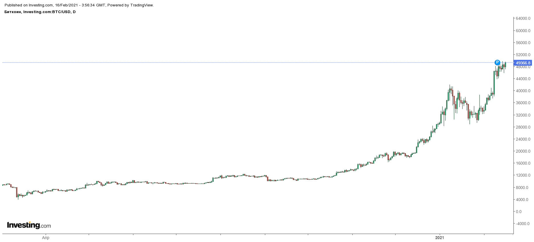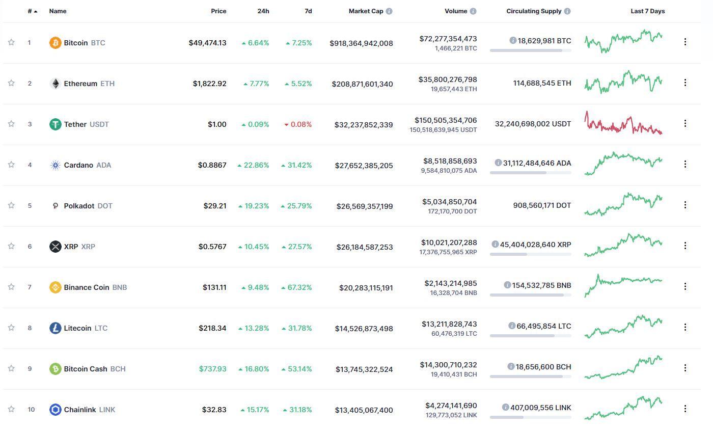 Вторник начался для всех криптовалют из топ-10 рейтинга капитализации ресурса CoinMarketCap с роста. Биткоин, по состоянию на 06:36 (МСК), торгуется по $49 474. За сутки криптовалюта подорожала на 6,64%, за неделю – на 7,25%.