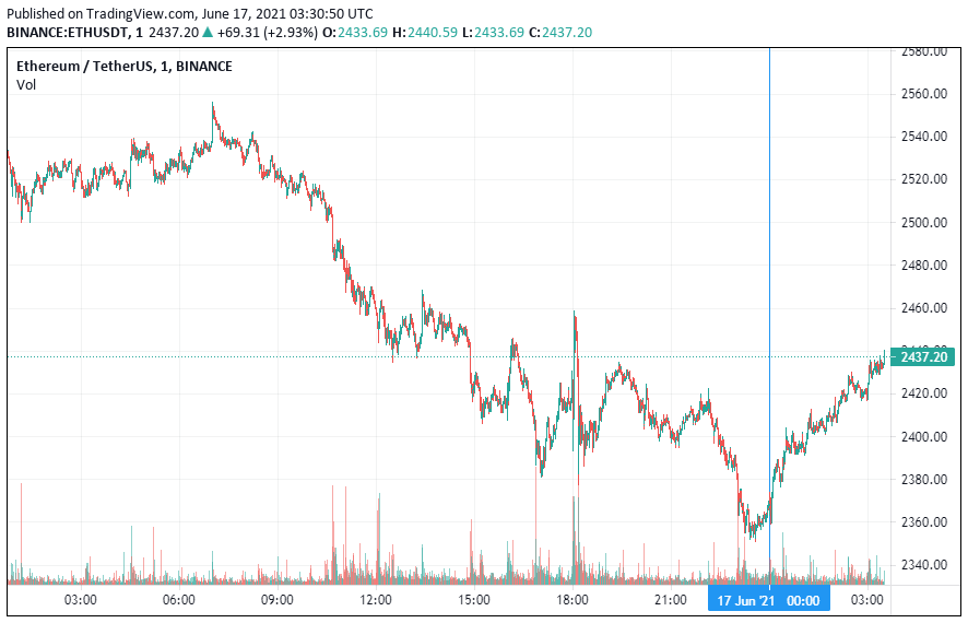 Вторая по капитализации криптовалюта – Ethereum – также начала день с небольшого роста. По состоянию на момент написания материала, монета торгуется по $2437.