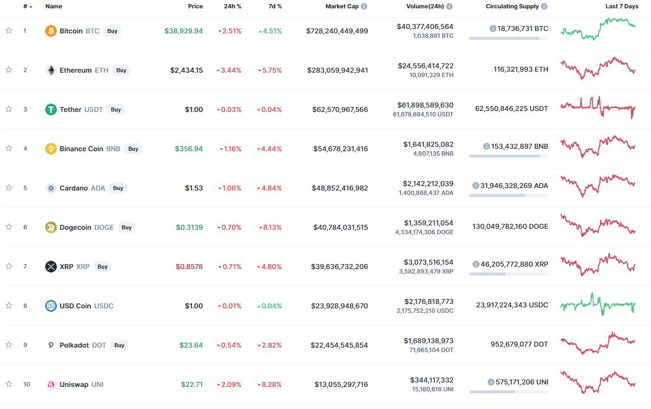 В топ-10 самых капитализированных криптовалют все монеты в течение 24 часов теряли в цене. Наибольшие потери зафиксированы у Ethereum (-3,44%). В течение недели активнее других рос биткоин (+4,51%), а терял в цене – Uniswap (-8,28%).
