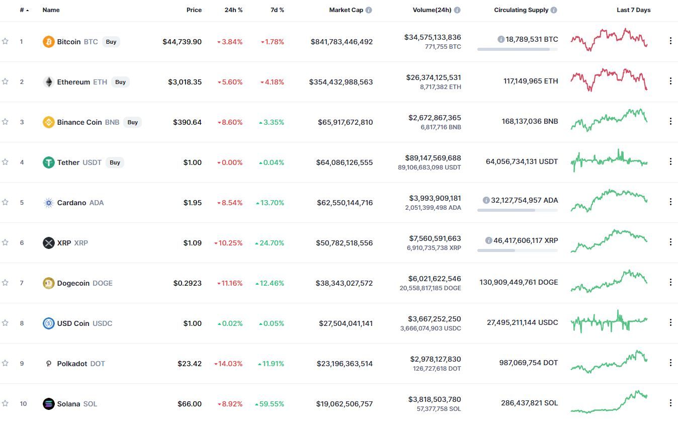 В топ-10 капитализации все монеты, за исключением стейблкоина USD Coin, продемонстрировали отрицательную динамику движения в течение 24 часов. Наибольшие потери за сутки зафиксированы у Polkadot (-14,03%). В течение недели активнее других терял в цене Ethereum (-4,18). Лучший результат движения за последние 7 дней зафиксирован у Solana (+59,55%).