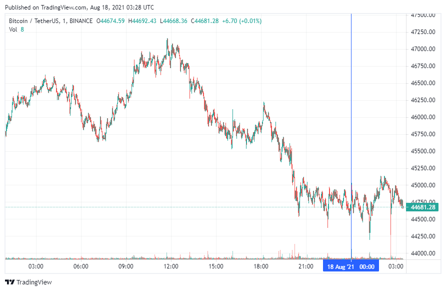 Биткоин (BTC) начал среду с бокового движения. По состоянию на 06:29 (МСК), криптовалюта торгуется по $44 681. Максимум стоимости биткоина за 24 часа, по данным ресурса CoinMarketCap, был зафиксирован на уровне $47 139, минимум – на высоте $44 364.