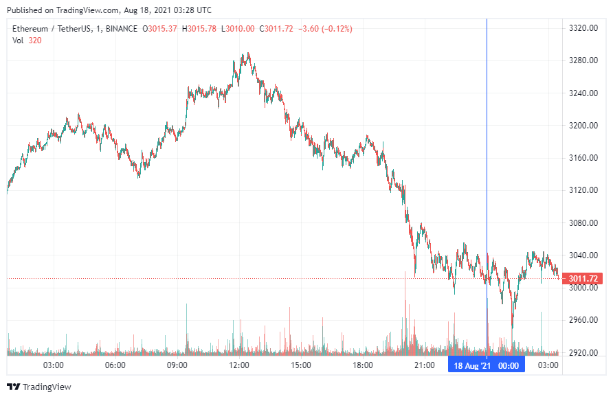Вторая по капитализации криптовалюта – Ethereum – также начала среду с бокового движения. По состоянию на момент написания новости, монета торгуется по $3011.