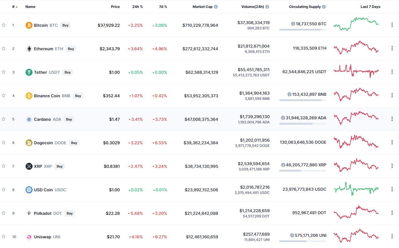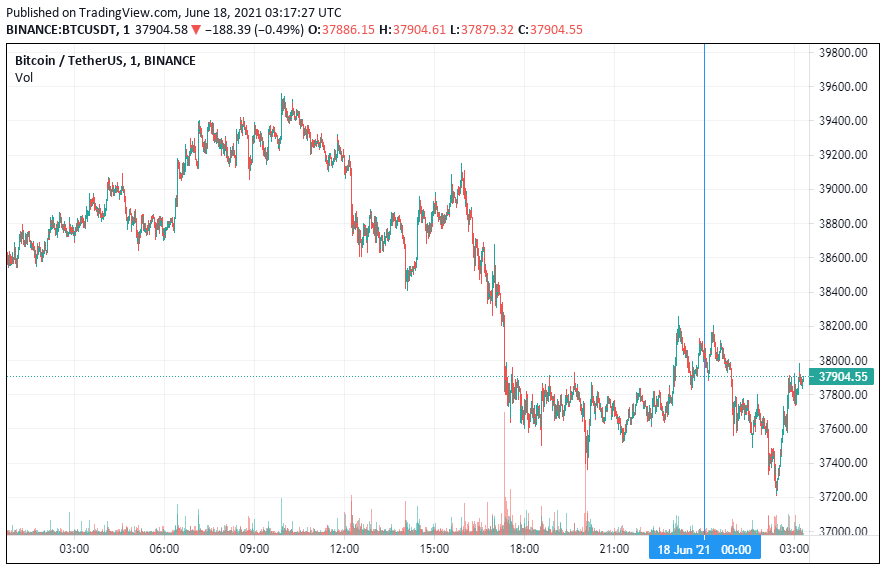 Биткоин (BTC) начал последний день рабочей пятидневки с падения. По состоянию на 06:18 (МСК), криптовалюта торгуется по $37 904. Еще вчера курс монеты находился выше уровня $39 тыс.