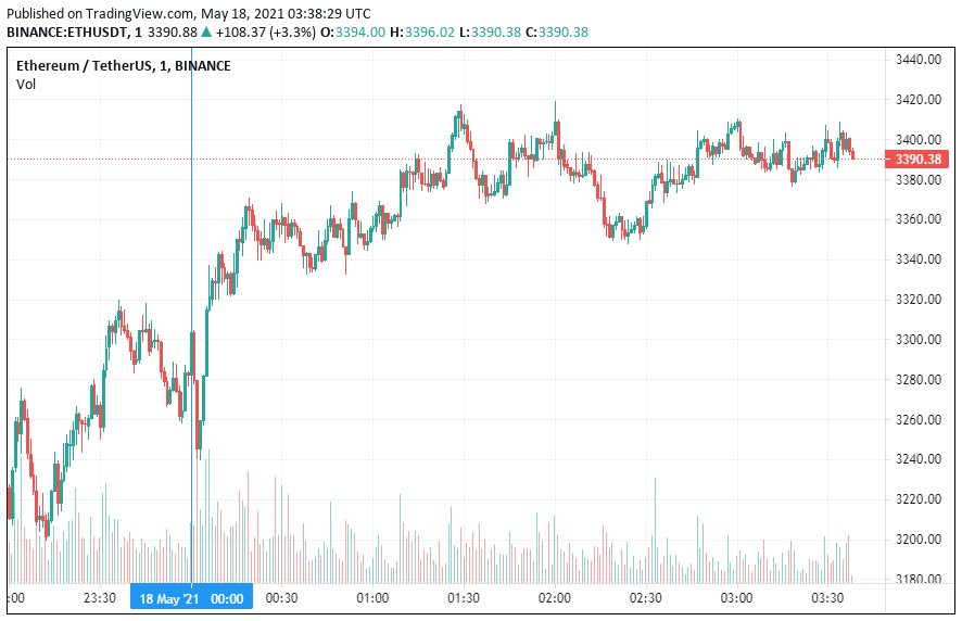 SponsoredВторая по капитализации криптовалюта Ethereum также начала вторник с небольшого роста. По состоянию на момент написания новости, монета торгуется по $3390.