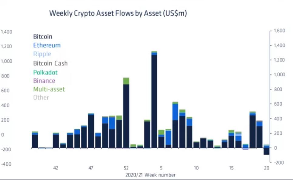 - Инвесторы выводят деньги из криптовалют. На это указывает статистика CoinShares. Согласно отчету компании, отток средств из фондов, ориентированных на работу с биткоином, в период с 7 по 14 мая, составил рекордные $98 млн.