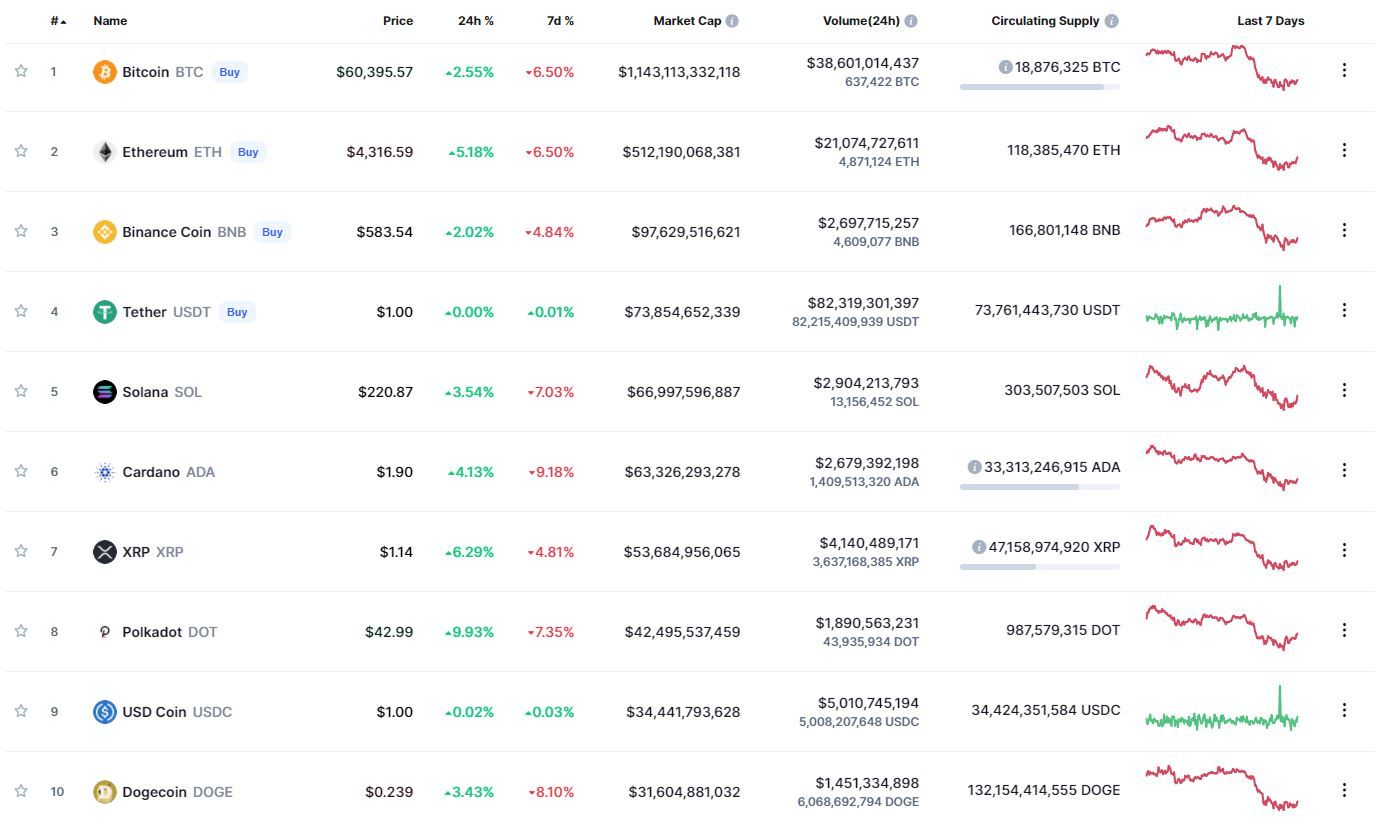 В топ-10 самых капитализированных криптовалют лучший результат движения за 24 часа зафиксирован у Polkadot (-9,93%). В рамках недели все монеты, за исключением стейблкоинов Tether и USD Coin, продемонстрировали отрицательную динамику. Наибольшие потери за 7 дней в топ-10 зафиксированы у Cardano (-9,18%).