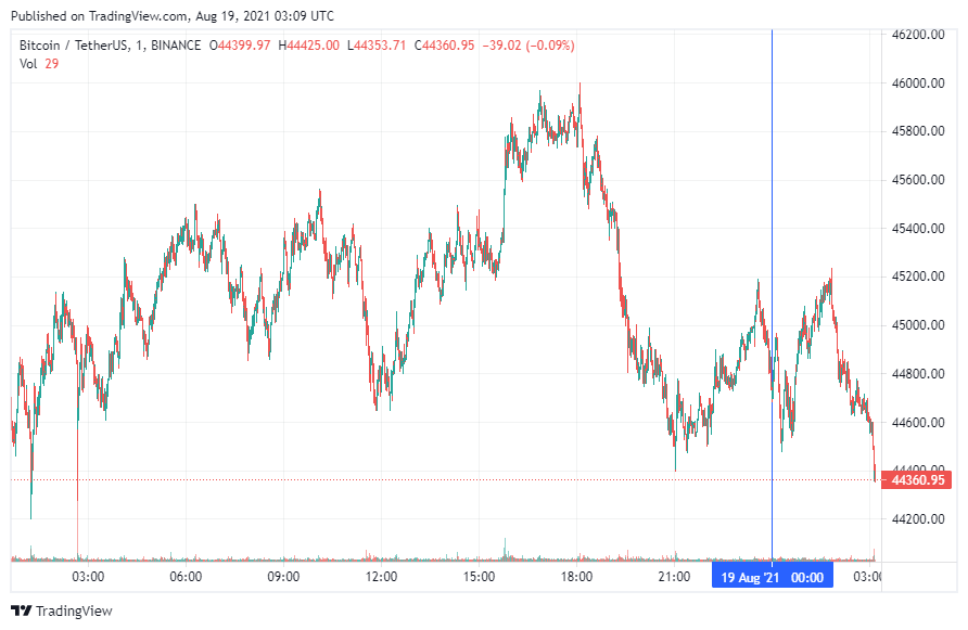 Биткоин (BTC) начал четверг со вспышки роста, которая перешла в коррекцию. По состоянию на 06:10 (МСК), монета торгуется по $44 360. Максимум стоимости биткоина за 24 часа зафиксирован на уровне $45 952.