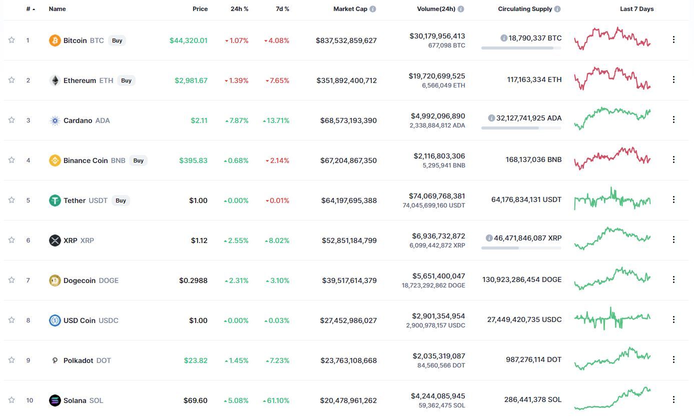 Наибольшие потери за сутки (-1,39%) и неделю (-7,65%) в топ-10 самых капитализированных криптовалют зафиксированы у Ethereum. Лучший результат роста за 24 часа продемонстрировал Cardano (+7,87%). В рамках недели активнее других рос Solana (+61,10%).