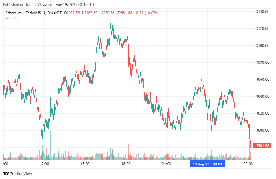Вторая по капитализации криптовалюта – Ethereum – также начала день со вспышки роста, которая перешла в коррекцию. По состоянию на момент написания новости, монета стоит $2981. Максимум стоимости Ethereum за сутки зафиксирован на уровне $3124.