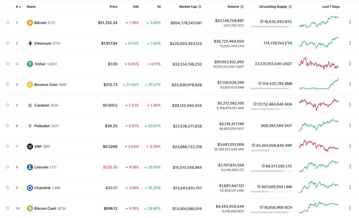 Пятница началась для большинства криптовалют из топ-10 рейтинга капитализации ресурса CoinMarketCap с падения. Биткоин, по состоянию на 05:57 (МСК), торгуется по $51 252. Криптовалюта вышла в коррекцию после достижения в ночь со среды на четверг абсолютного максимума на высоте $52 533.