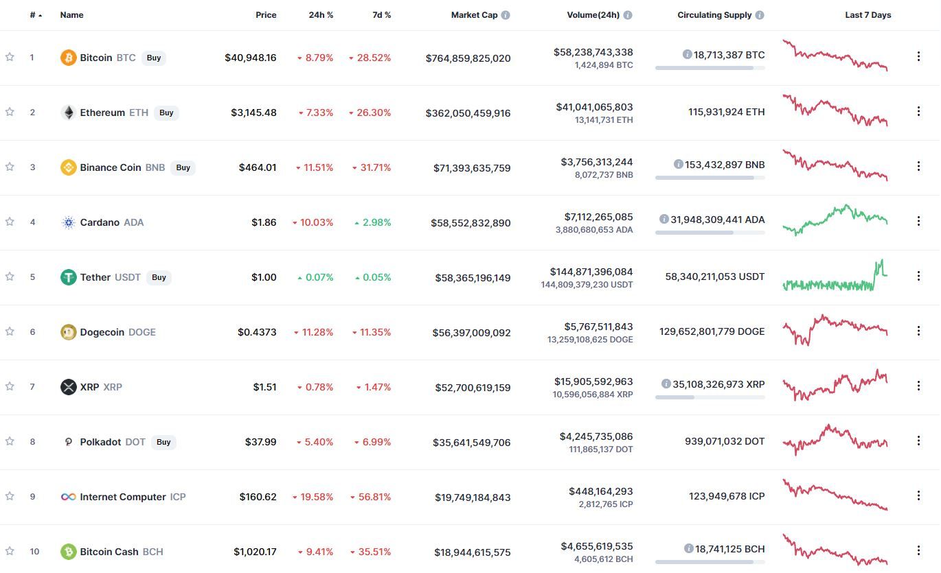 В топ-10 самых капитализированных криптовалют наибольшие потери за сутки (-19,58%) и неделю (-56,81%) претерпел Internet Computer. Единственной монетой из первой десятки, за исключением стейблкоина Tether, которой удалось сохранить позитивную динамику движения в течение 7 дней, оказалась Cardano (+2,98%).