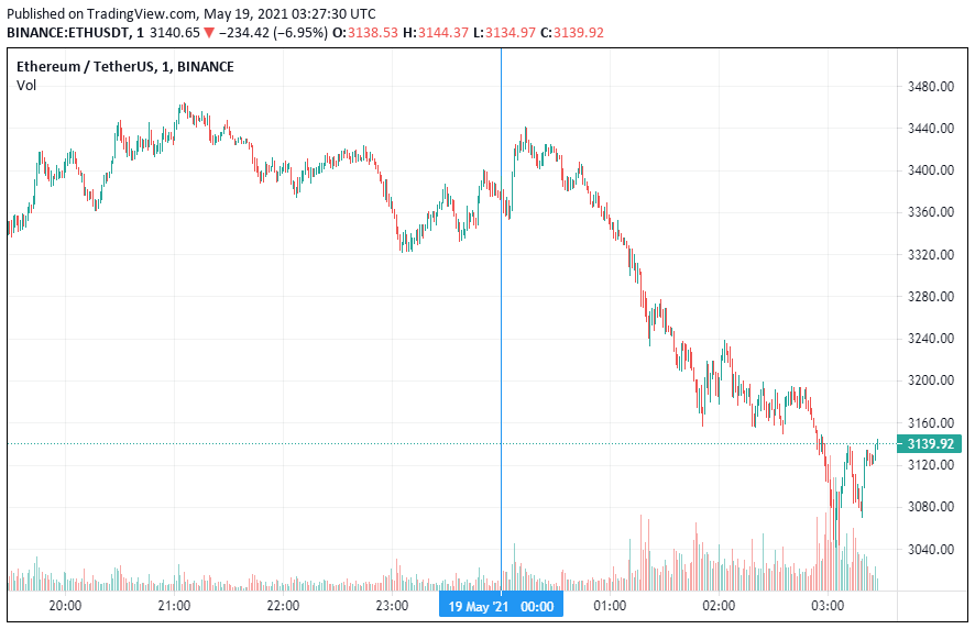 Вторая по капитализации криптовалюта – Ethereum – также начала среду с падения. По состоянию на момент написания новости, монета торгуется по $3139. Минимум за 24 часа зафиксирован на высоте $3065.