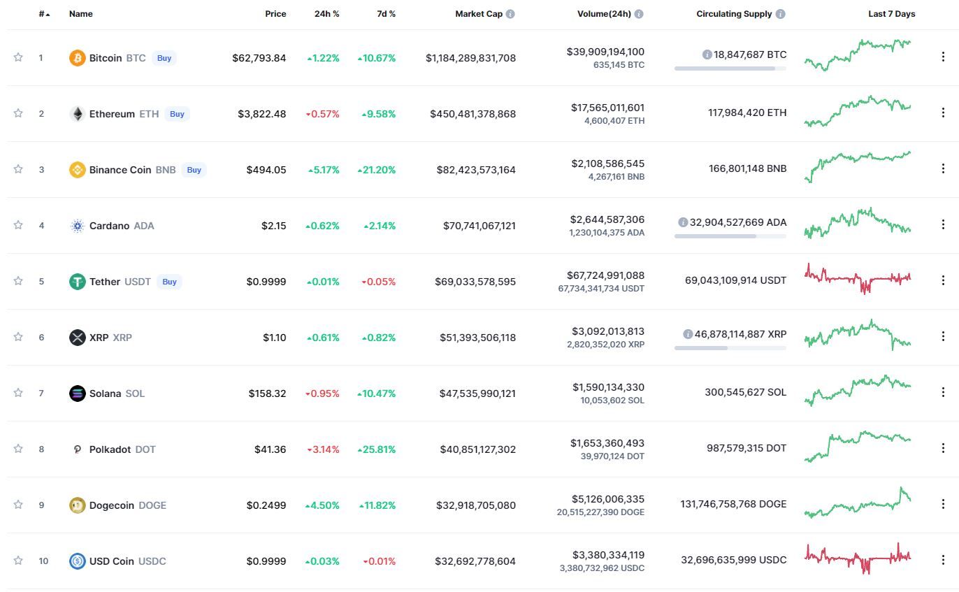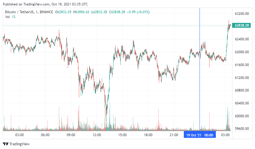 Биткоин (BTC) начал вторник с роста. По состоянию на 06:36 (МСК), криптовалюта торгуется по $62 838. Минимум стоимости монеты за 24 часа, по данным ресурса CoinMarketCap, зафиксирован на уровне $60 012, максимум – на высоте $62 944. Напомним, дороже всего биткоин стоил 14 апреля 2021 года ($64 863). Монета вплотную приблизилась к абсолютному максимуму. Криптовалюта вышла в рост на фоне ожидаемого запуска в США торгов ETF на базе криптодеривативов.