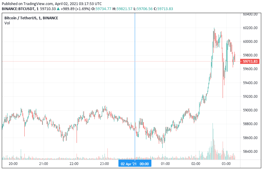 На утренних торгах в пятницу, 2 апреля, биткоин (BTC) попытался преодолеть отметку $60 000 и зафиксировал внутридневной максимум на уровне $60 055. Однако закрепится выше ключевого сопротивления не удалось. На момент написания статьи монета торгуется по $59 944. За сутки криптовалюта подорожала на 0,94%, за неделю – на 14,81%.