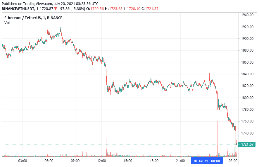 Вторая по капитализации криптовалюта – Ethereum – также теряет в цене. По состоянию на момент написания новости монета торгуется по $1721.