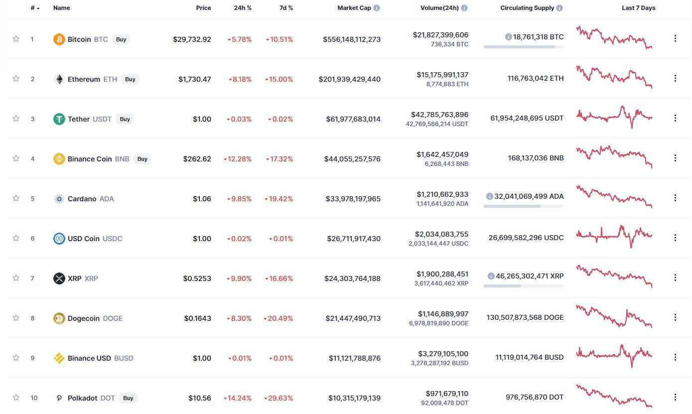 В топ-10 самых капитализированных криптовалют все монеты продемонстрировали отрицательную динамику движения за сутки и неделю. Наибольшие потери за 24 часа (-14,24%) и неделю (-29,63%) зафиксированы у Polkadot.