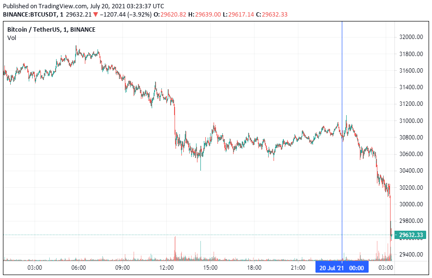 Биткоин (BTC) начал вторник с падения. Утром курс криптовалюты пробил уровень $30 тыс. По состоянию на 06:25 (МСК), биткоин торгуется по $29 623.