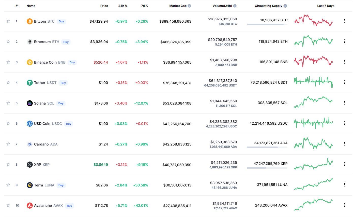 В топ-10 самых капитализированных криптовалют лучший результат за 24 часа зафиксирован у Avalanche (+5,71%), за неделю – у Terra (+50,58%). Больше других в течение суток потерял в цене Solana (-3,40%). Наибольшие потери за последние 7 дней зафиксированы у Binance Coin (-1,11%).