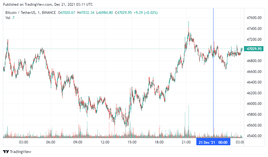 Биткоин (BTC) начал вторник с небольшой коррекции, которая перешла в боковое движение. По состоянию на 06:17 (МСК), криптовалюта торгуется по $47 029. Минимум стоимости биткоина за 24 часа зафиксирован на уровне $45 579, максимум – на высоте $47 401.