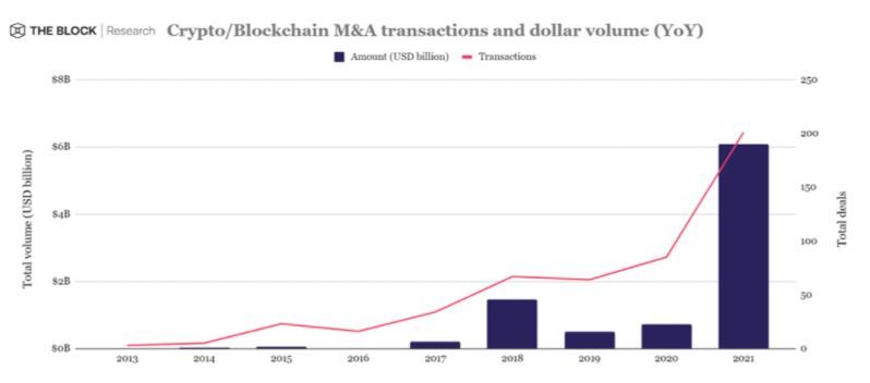 В 2021 году на крипторынке было зафиксировано 197 сделок M&A. Годом ранее показатель остановился на отметке 85.