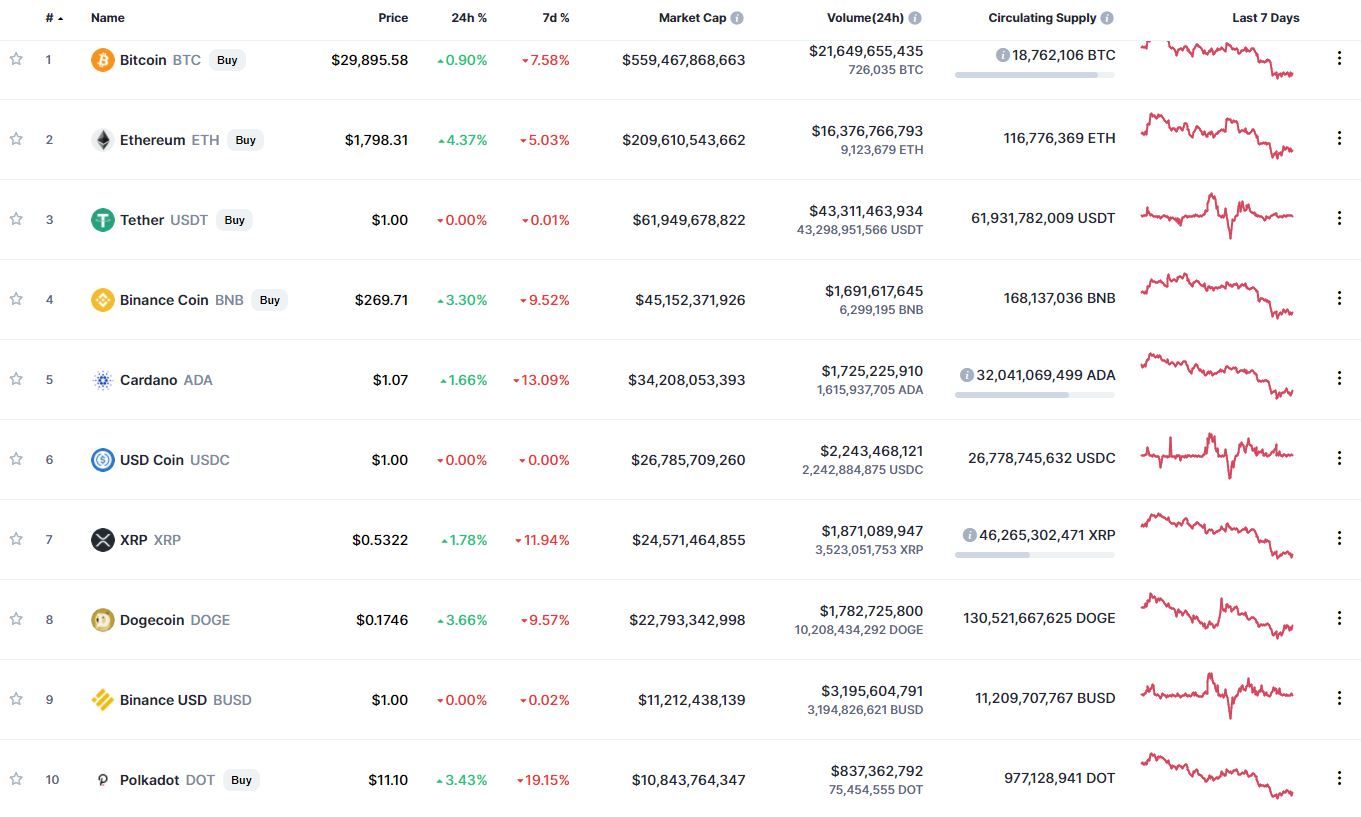 В топ-10 самых капитализированных криптовалют лучший результат движения за сутки зафиксирован у Ethereum (+4,37%). В течение недели все монеты продемонстрировали отрицательную динамику. Наибольшие потери за 7 дней зафиксированы у Polkadot (-19,15%).