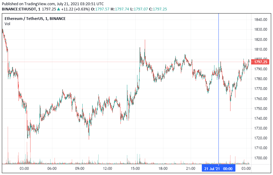 Вторая по капитализации криптовалюта – Ethereum – продолжила консолидацию в среду. По состоянию на момент написания новости монета торгуется по $1797.