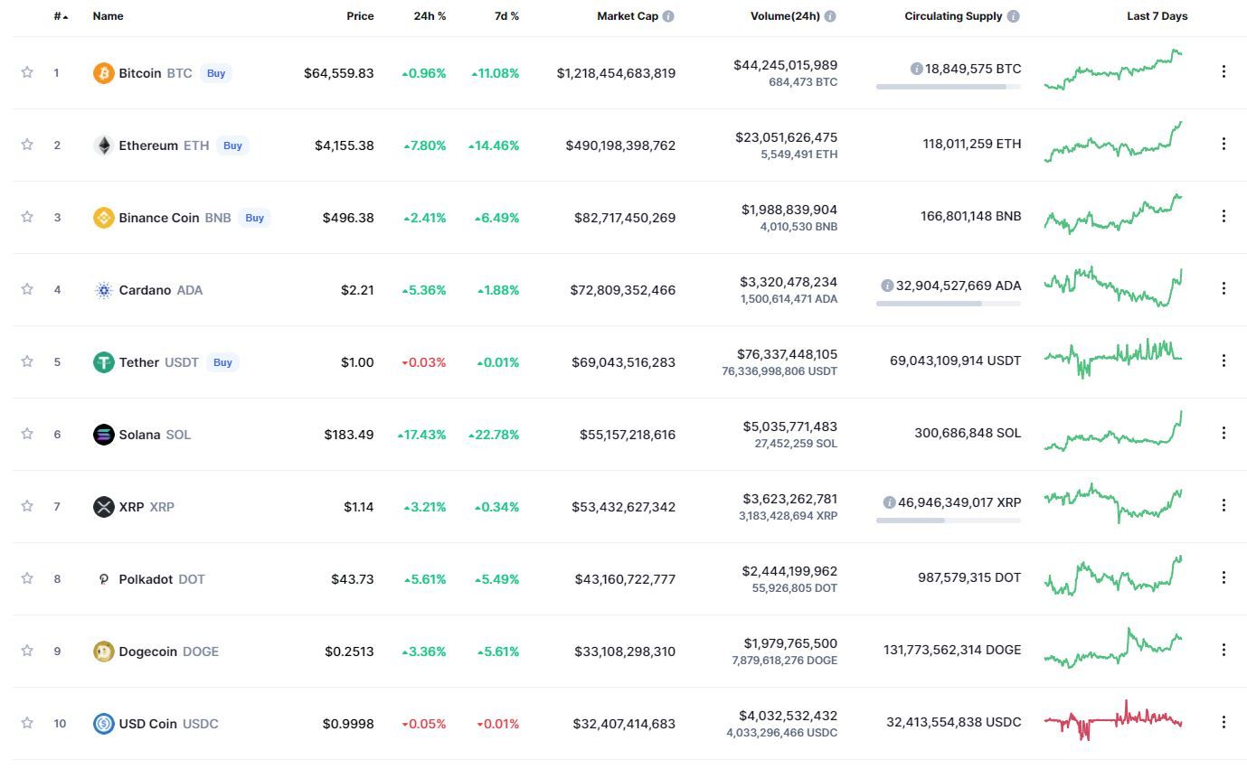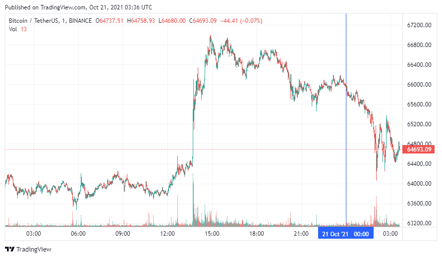 Биткоин (BTC) начал четверг с коррекции. По состоянию на 06:37 (МСК), криптовалюта торгуется по $64 693. Вчера вечером биткоин обновил абсолютный максимум стоимости на высоте $66 930.