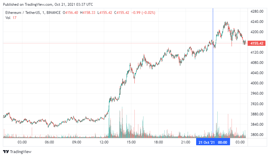 Вторая по капитализации криптовалюта – Ethereum – начала день с небольшого роста, который перешел в коррекцию. По состоянию на момент написания новости, монета торгуется по $4155.
