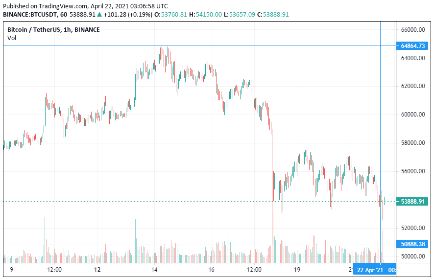 Самая капитализированная криптовалюта – биткоин – начала четверг с небольшого роста, за которым последовало падение. По состоянию на 06:07 (МСК), монета торгуется по $53 888. Напомним, биткоин вышел в падение после достижения в середине апреля абсолютного максимума стоимости близ уровня $65 тыс. Локальный минимум криптовалюты зафиксирован на высоте $50 888.