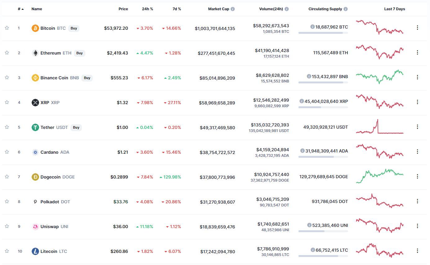 В топ-10 самых капитализированных криптовалют лучший результат движения за сутки зафиксирован у Uniswap (+11,18%), за неделю – у Dogecoin (+129,98%). Активнее других в течение 24 часов терял в цене XRP (-7,98%). Также у токена зафиксированы наибольшие потери за неделю (-27,11%).