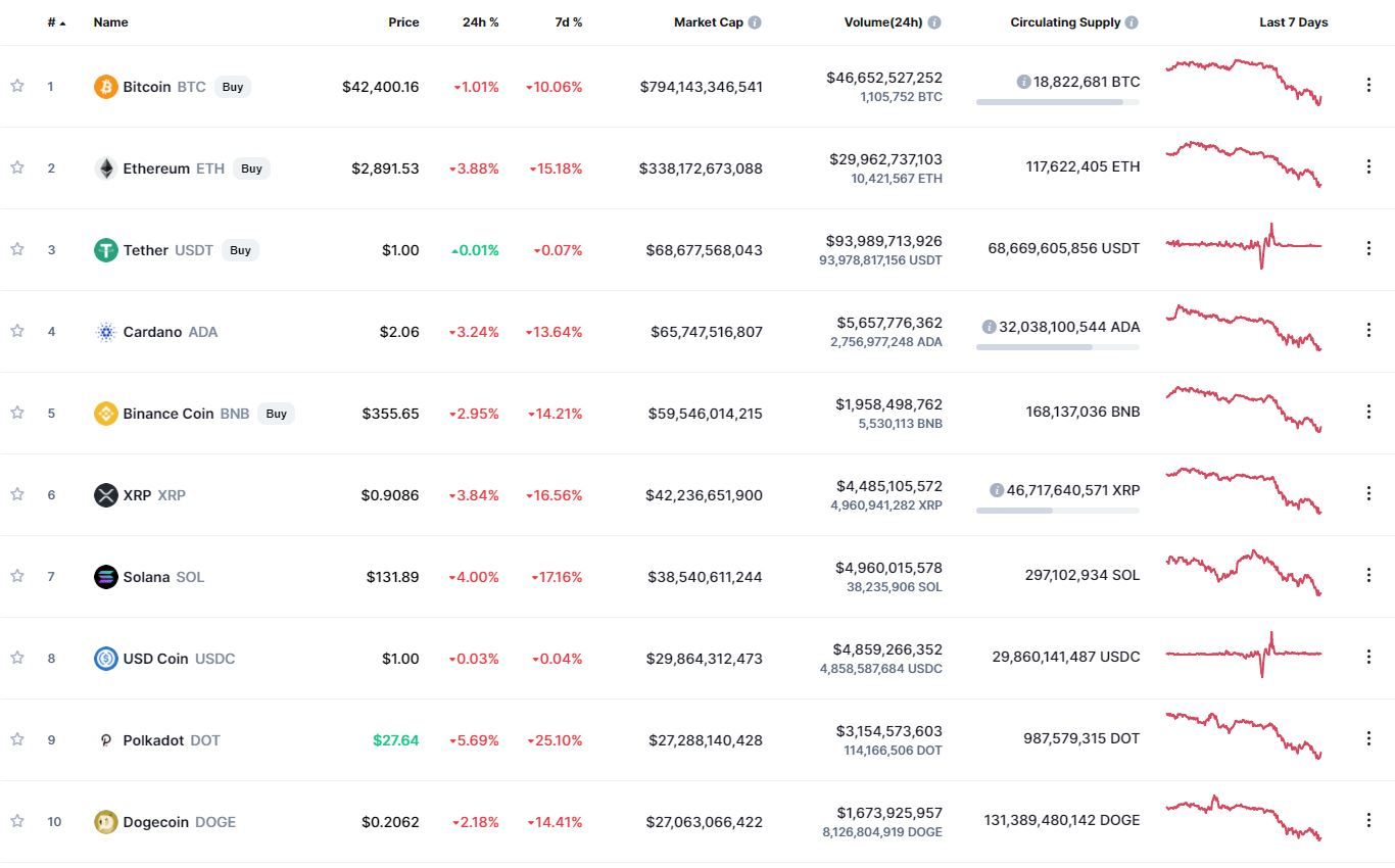 Все монеты, за исключением стейблкоина Tether, продемонстрировали отрицательную динамику движения в течение суток и недели. Наибольшие потери за 24 часа (-5,69%) и последние 7 дней (-25,10%) зафиксированы у Polkadot.
