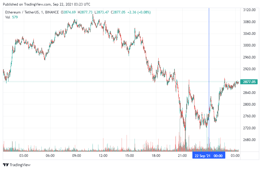 Вторая по капитализации криптовалюта – Ethereum – повторила траекторию движения биткоина. По состоянию на момент написания новости монета торгуется по $2877.