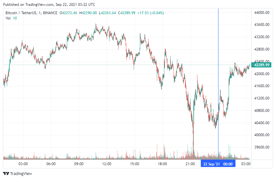 Биткоин (BTC) начал среду с падения, за которым последовала коррекция. По состоянию на 06:23 (МСК), криптовалюта торгуется по $42 289. Минимум стоимости BTC за сутки зафиксирован на уровне $39 787, максимум – на высоте $43 607.