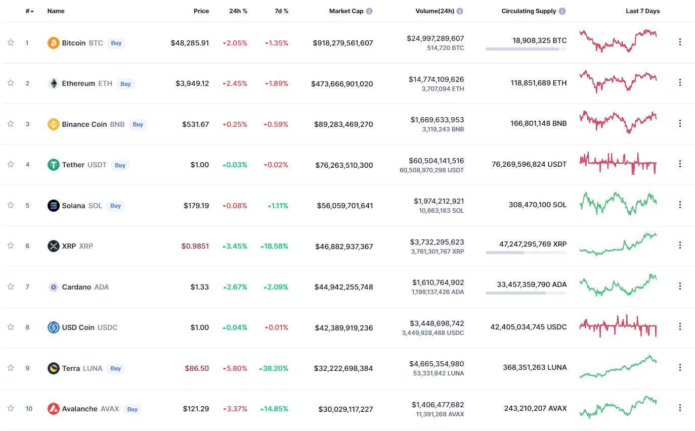В топ-10 самых капитализированных криптовалют лучший результат за 24 часа зафиксирован у XRP (+3,45%). В рамках недели активнее других рос Terra (+38,20%). При этом у криптовалюты зафиксированы наибольшие потери за сутки (-5,80%). В рамках недели активнее других терял в цене Ethereum (-1,89%).