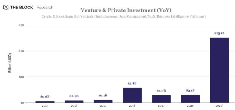 - В 2021 году криптокомпании привлекли рекордный объем венчурного финансирования. Показатель превысил $25 млрд. На это указывает статистика The Block.