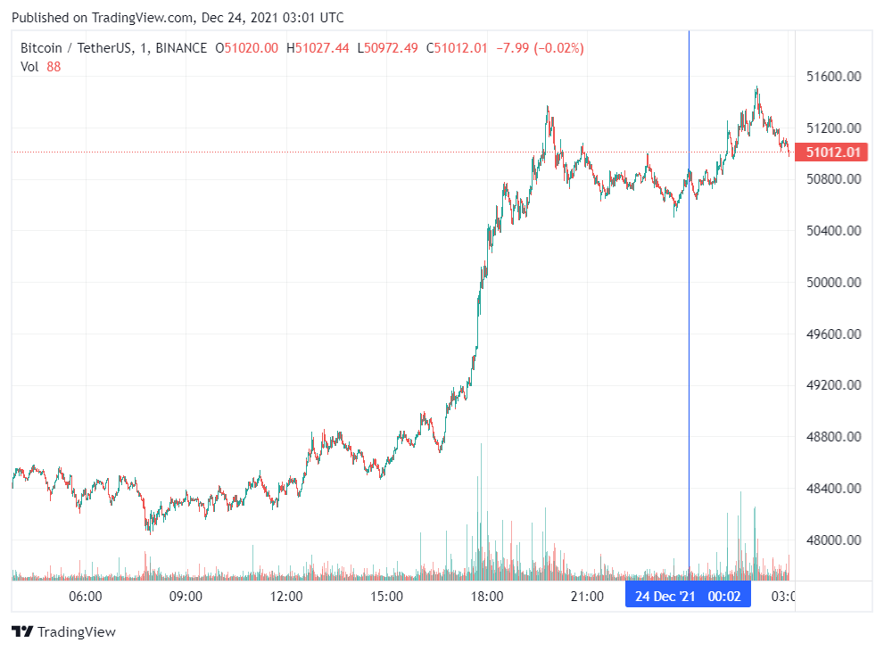 Биткоин (BTC) начал последний день рабочей пятидневки с роста. По состоянию на 06:02 (МСК), криптовалюта торгуется по $51 012. Минимум стоимости монеты за 24 часа, по данным ресурса CoinGecko, был зарегистрирован на уровне $48 280, максимум – на высоте $51 519.